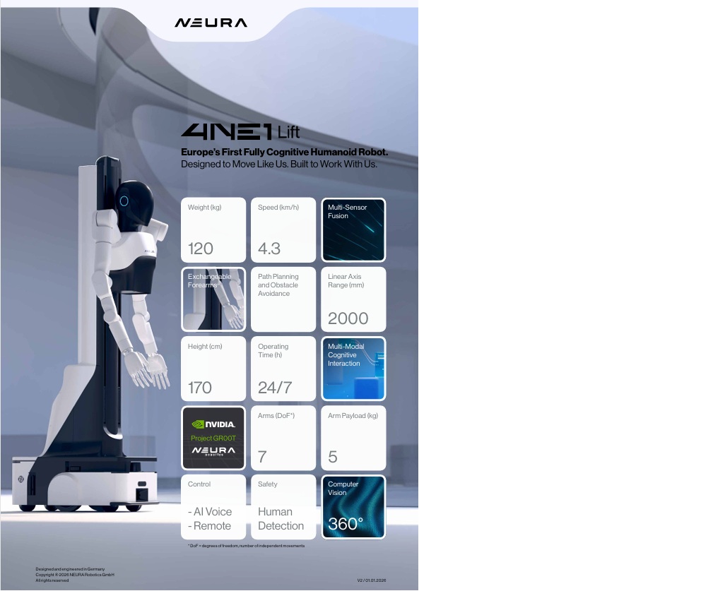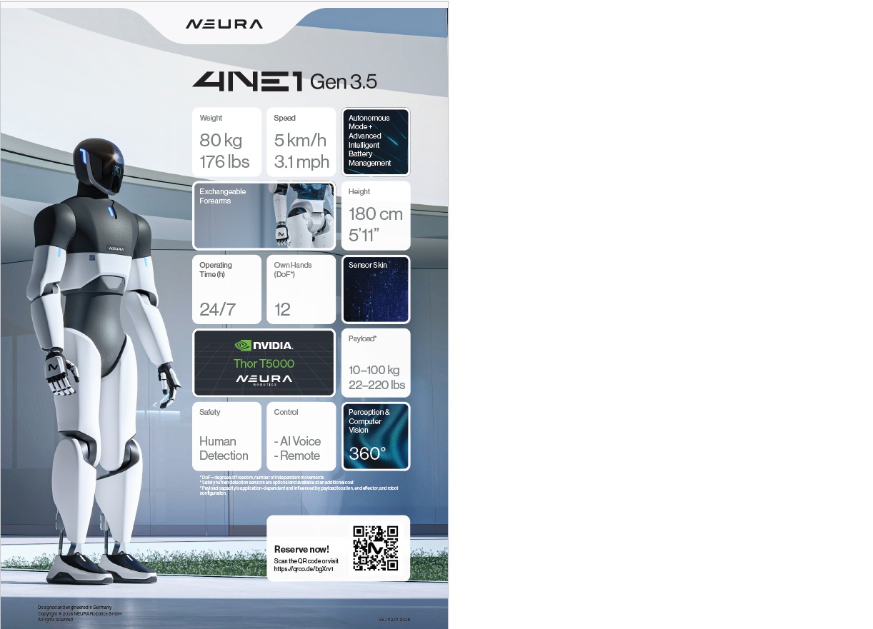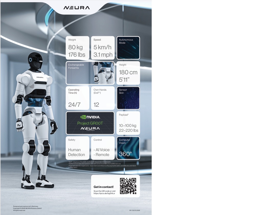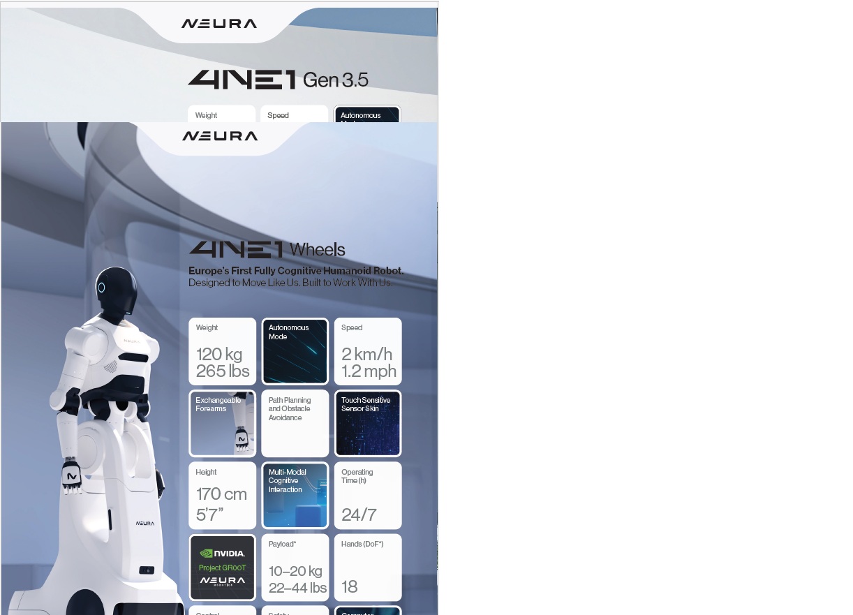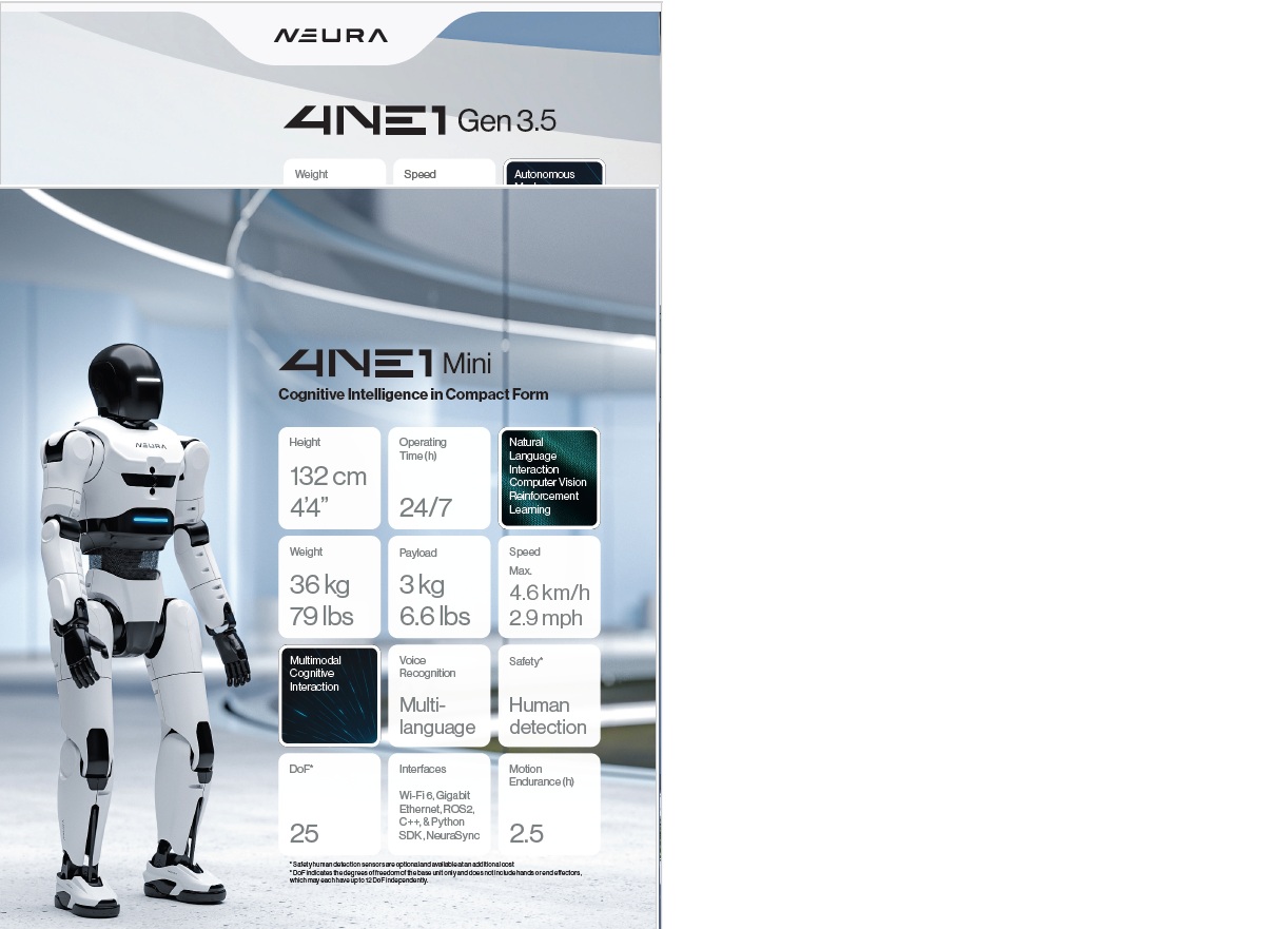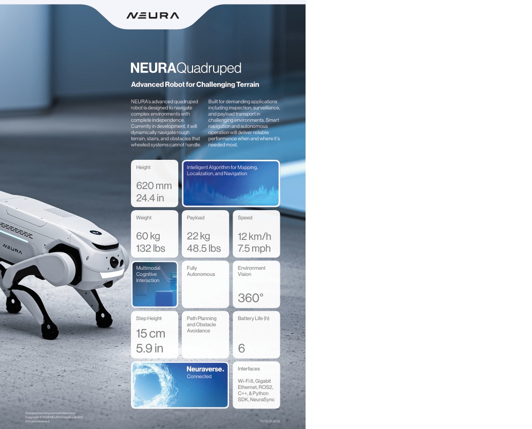 NEURA 開發中的高階四足機器人,專為能夠完全自主導航複雜環境而設計。它能夠靈活穿越:崎嶇地形/樓梯/傳統輪型機器無法克服的障礙物,目前仍在開發階段,未來將具備高機動性與地形適應能力。